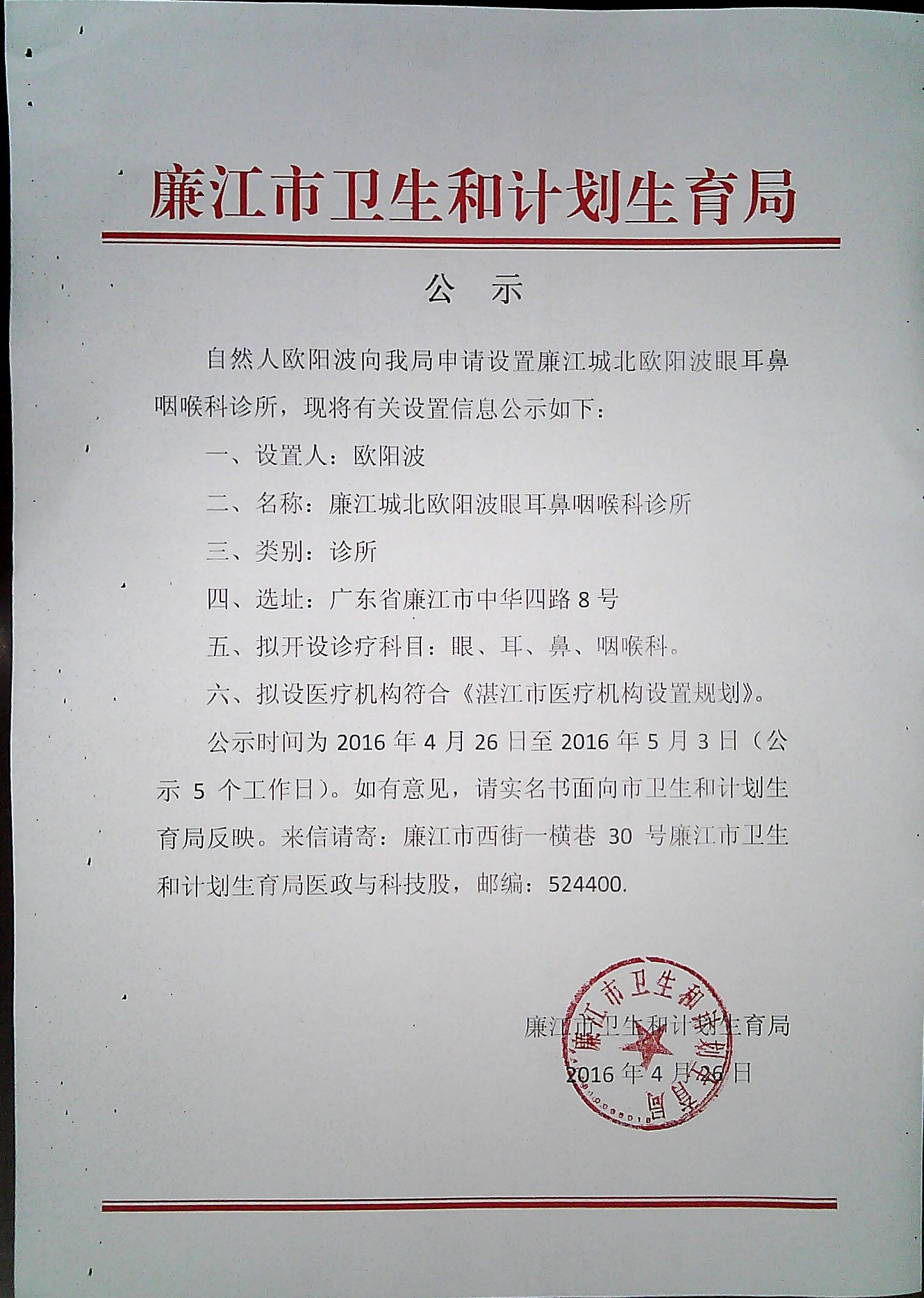 关于申请设置城北欧阳波眼耳鼻咽喉科诊所的公示