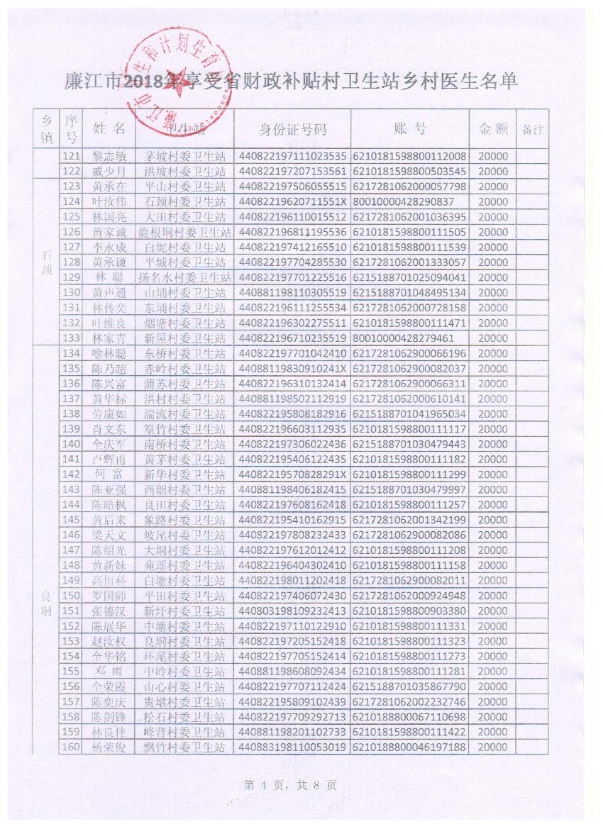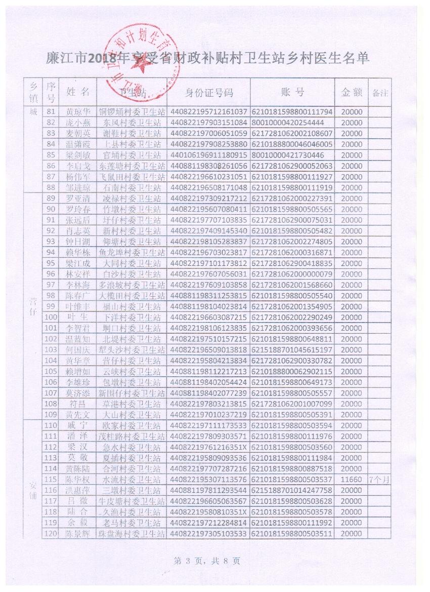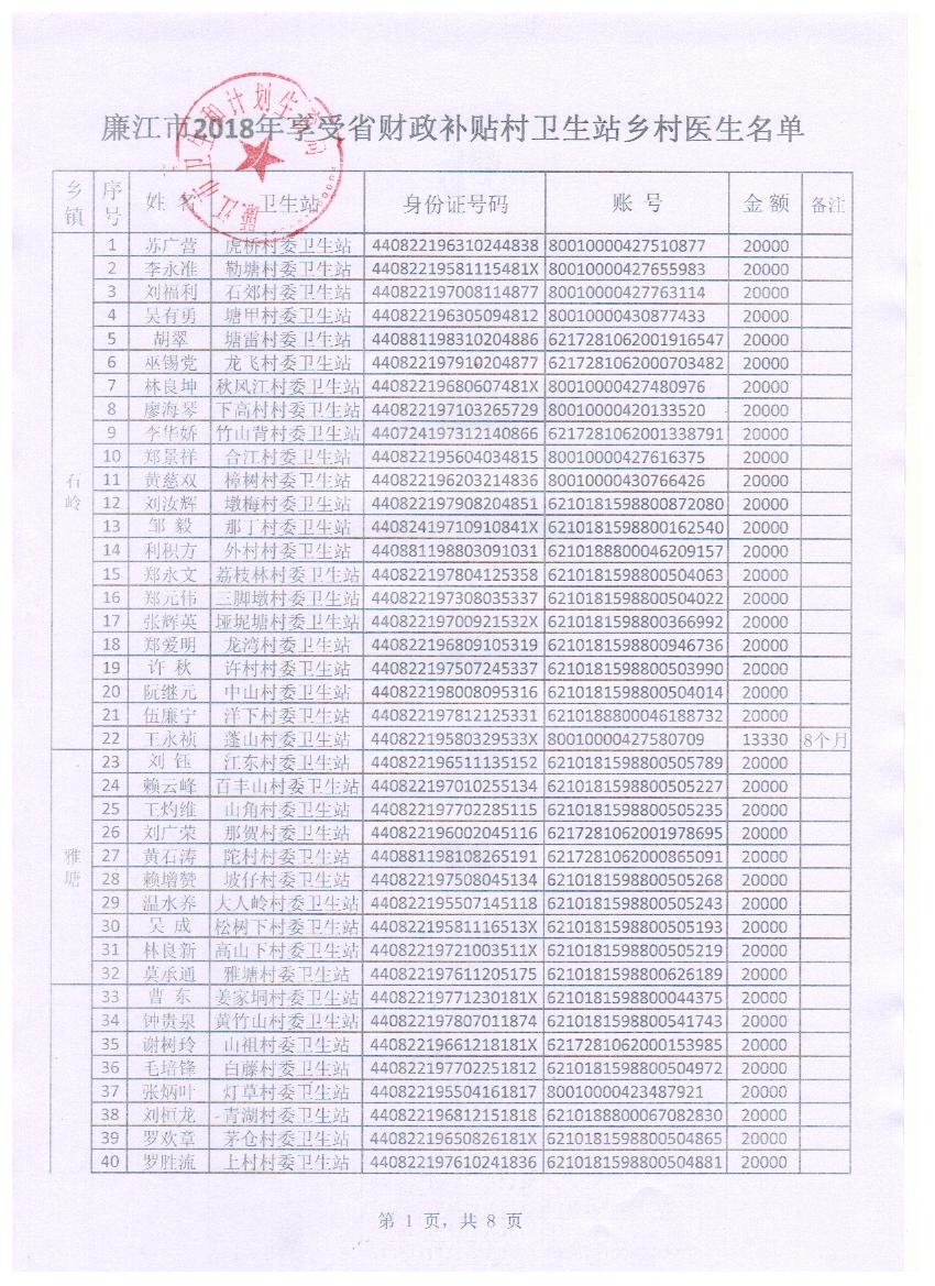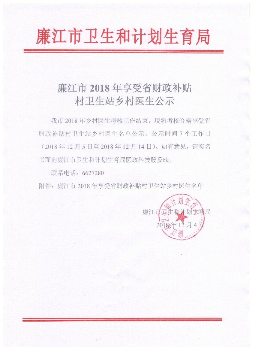 廉江市2018年享受省财政补贴村卫生站乡村医生公示
