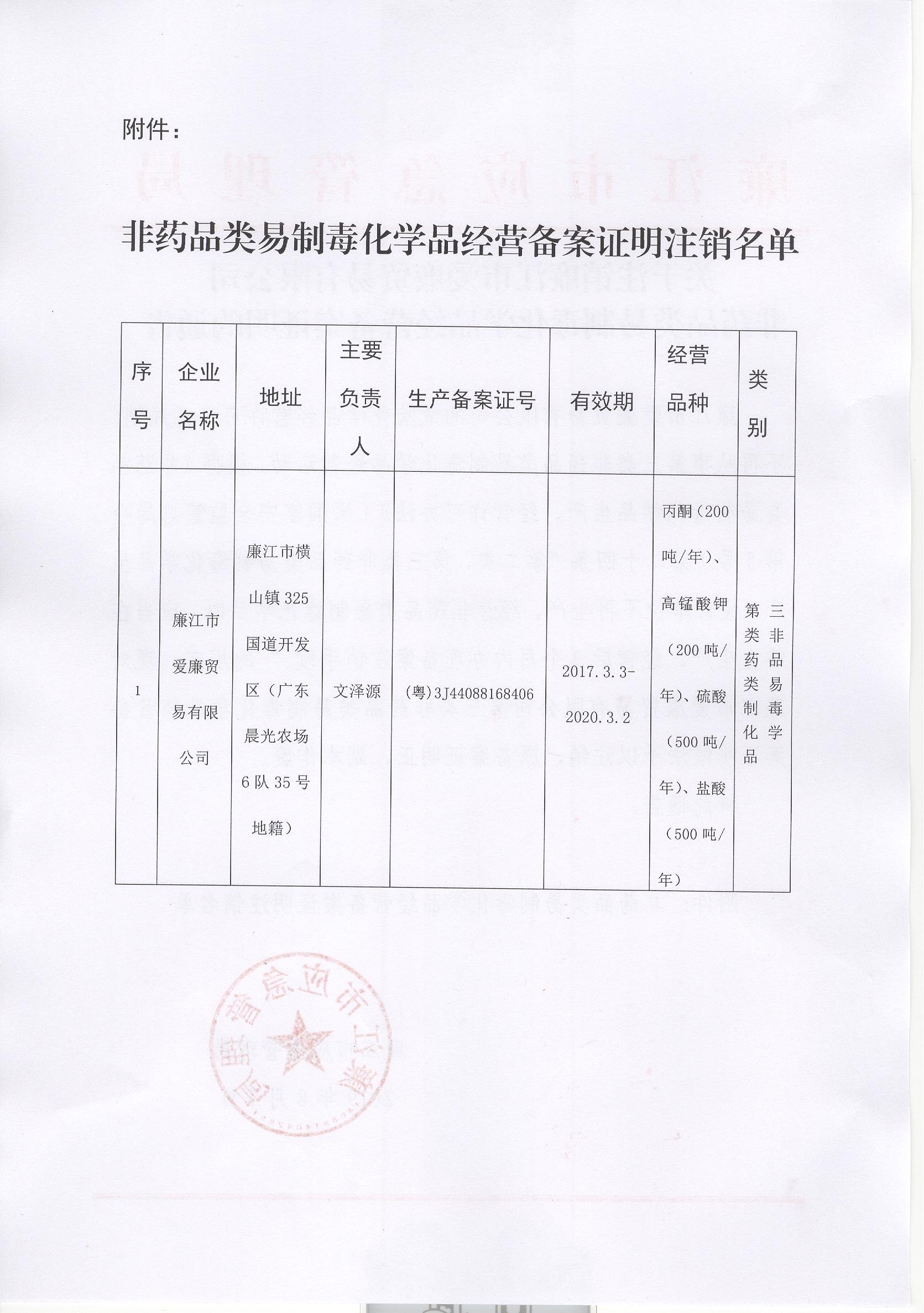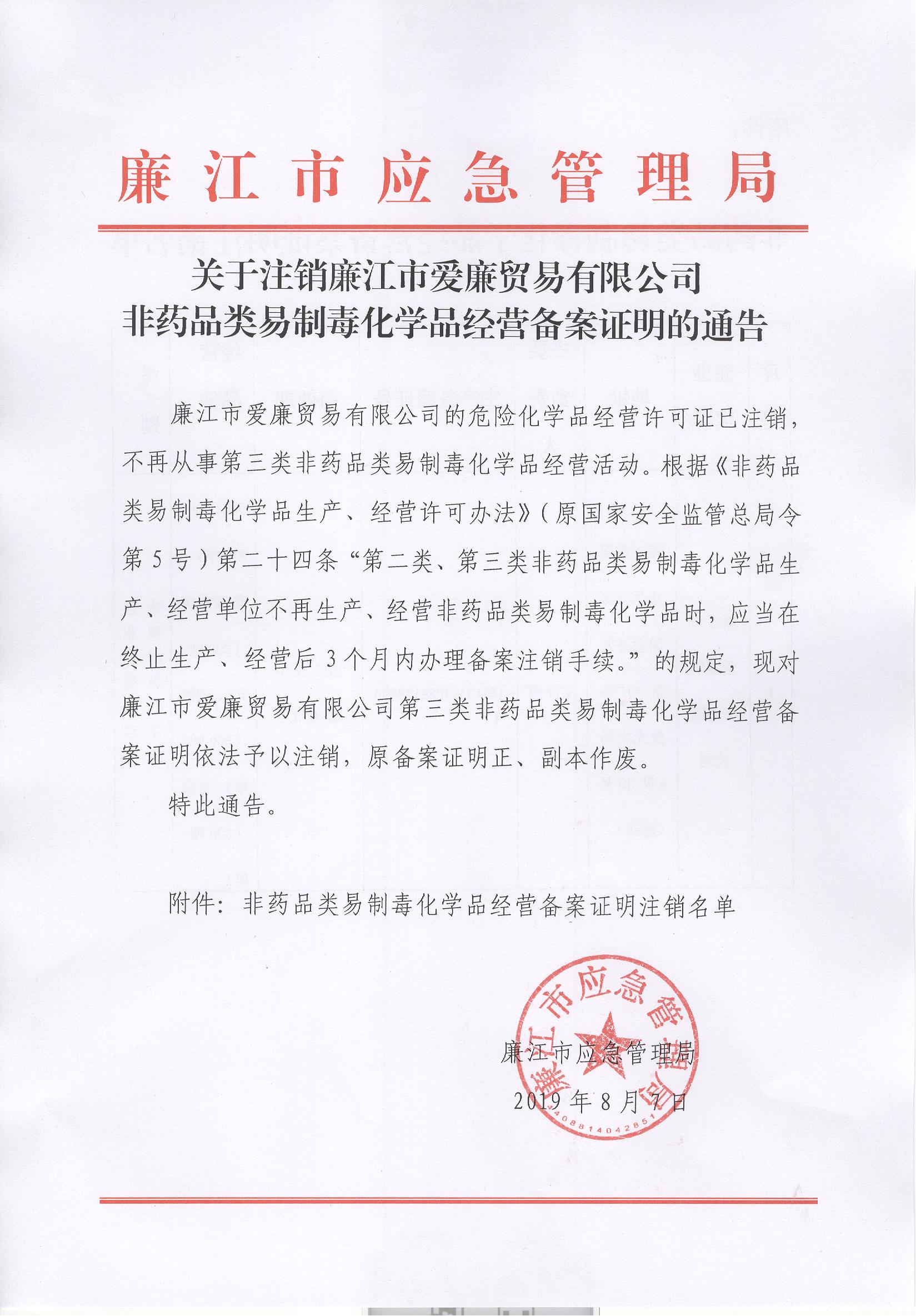 关于注销廉江市爱廉贸易有限公司非药品类易制毒化学品经营备案证明的通告