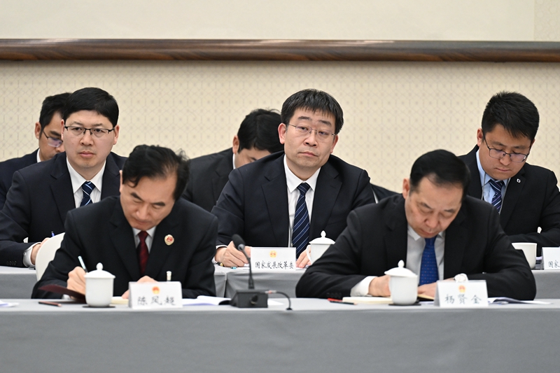 3月5日,国家发展改革委派员(中)在十四届全国人大二次会议天津代表团全体会议上现场旁听记录。新华社记者 李鑫 摄