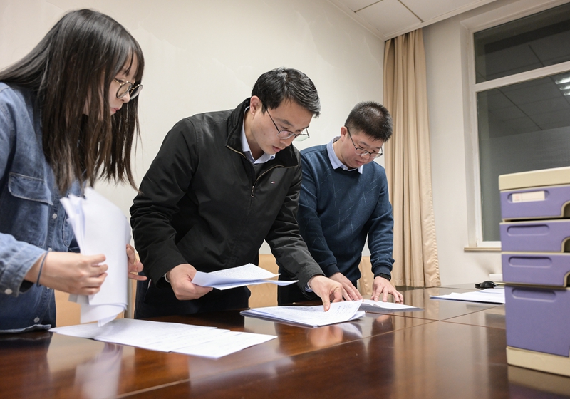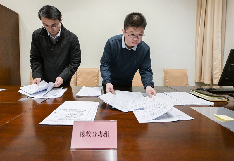 3月5日,在国务院办公厅的一间办公室内,接收分办组的工作人员整理从会场收集的意见建议材料。新华社记者 李贺 摄