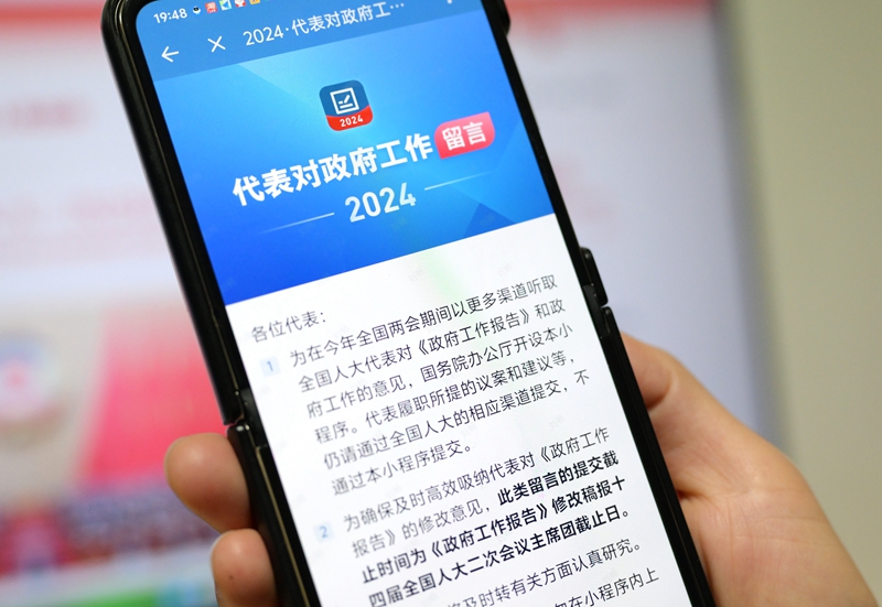 3月5日,工作人员向记者展示“2024·代表对政府工作留言”小程序。新华社记者 李贺 摄