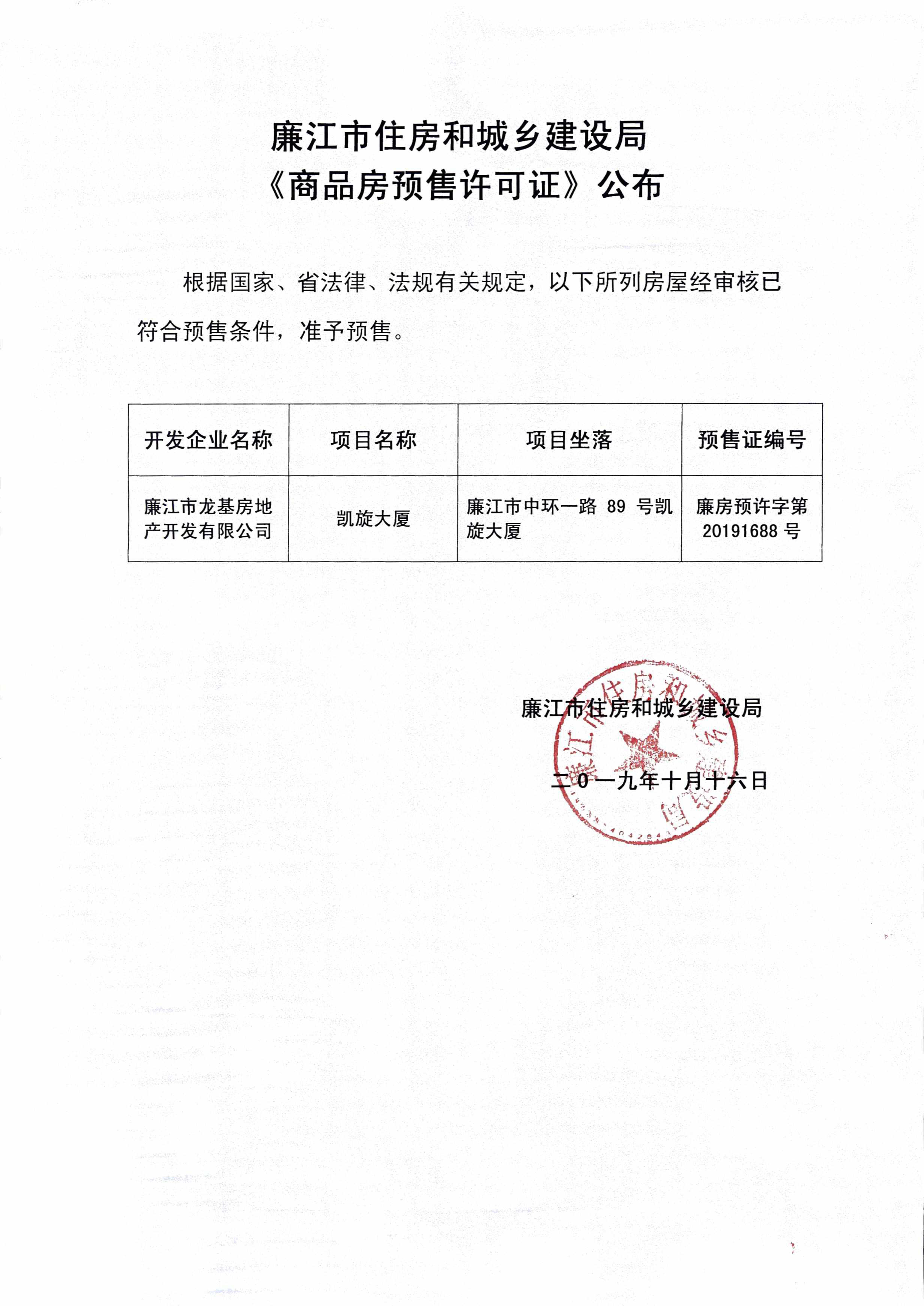 廉江市住房和城乡建设局《商品房预售许可证》公布