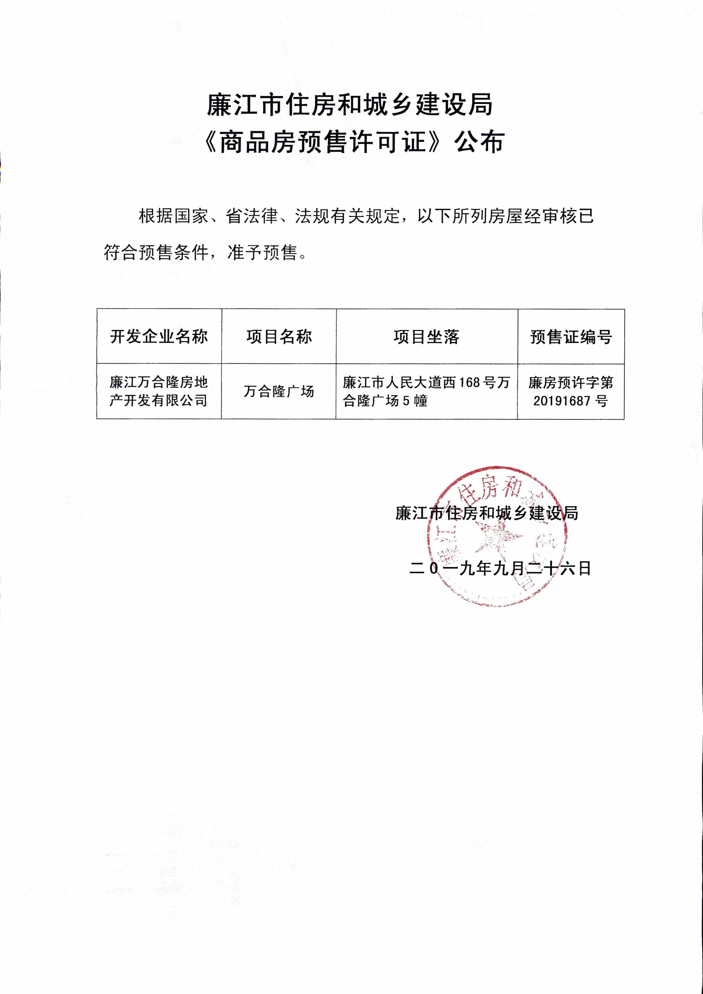 廉江市住房和城乡建设局《商品房预售许可证》公布