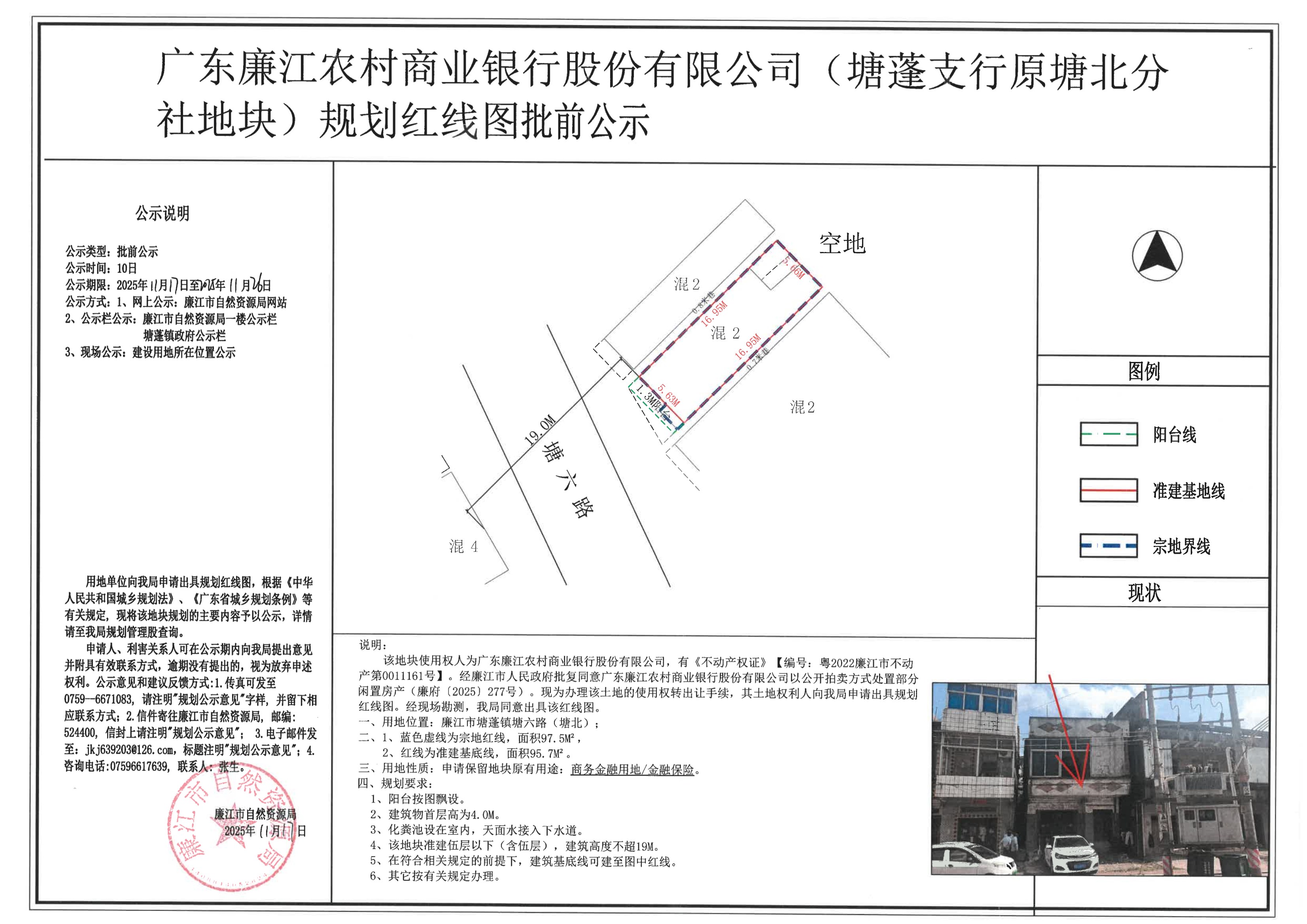 广东廉江农村商业银行股份有限公司(塘蓬支行原塘北分社地块)规划红线图批前公示