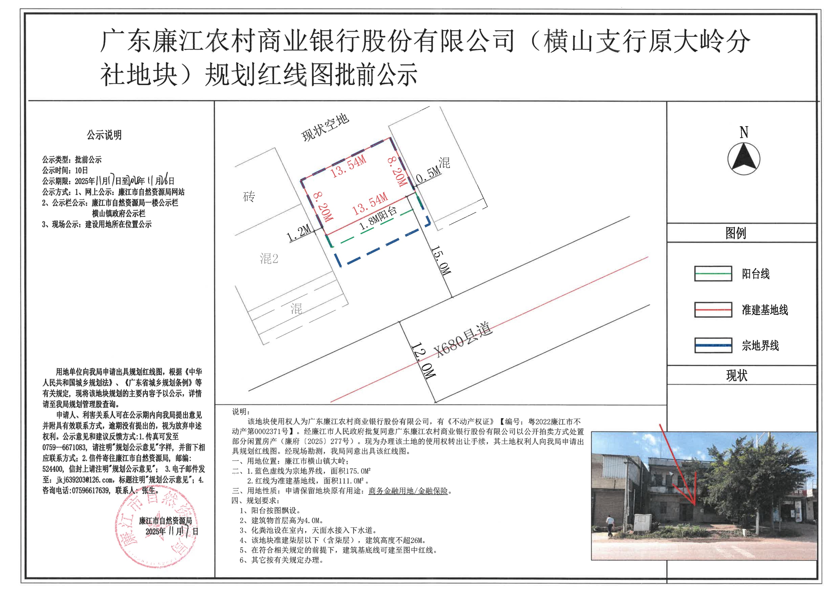 广东廉江农村商业银行股份有限公司(横山支行原大岭分社地块)规划红线图批前公示