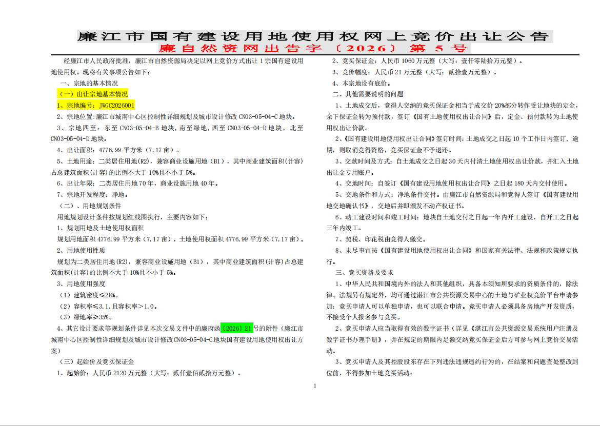 廉江市自然资源局国有土地使用权挂牌出让公告(廉自然资网出告字[2026]5号)
