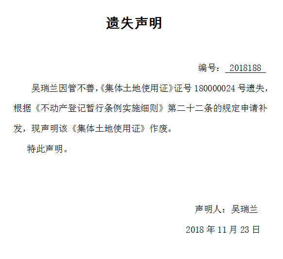 遗失声明 编号: 2018188