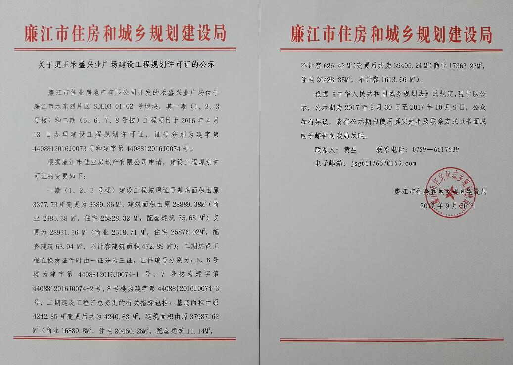 关于更正禾盛兴业广场建设工程规划许可证的公示