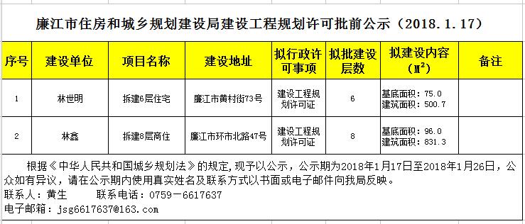 廉江市住房和城乡规划建设局建设工程规划许可批前公示(2018.1.17)