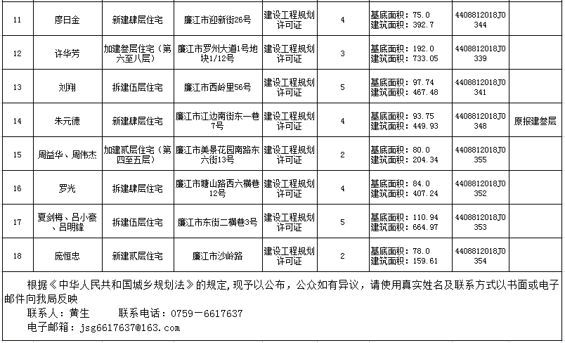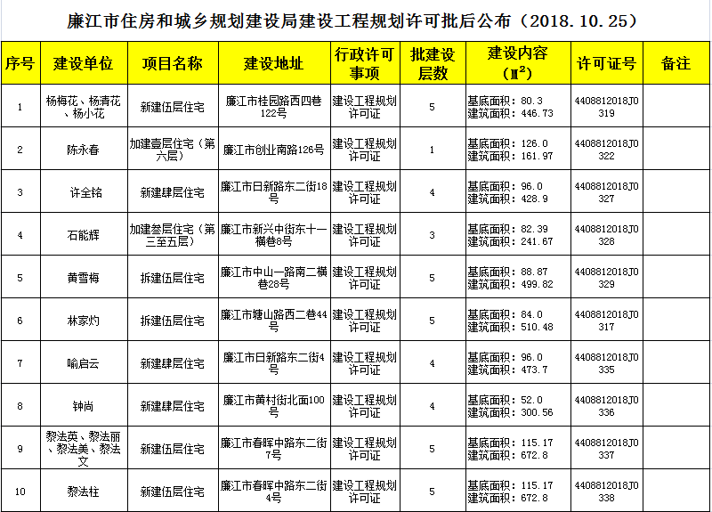 廉江市住房和城乡规划建设局建设工程规划许可批后公布(2018.10.25)