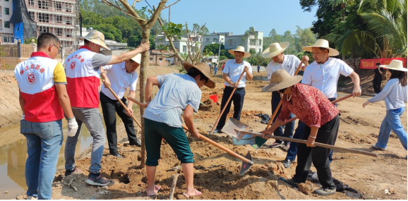 大家来到石湾村委中心垌村,按照划定区域进行植树,各小分队挥锹挖坑、扶正树苗、铲土填苗、提桶浇水,热情高涨、干劲十足……经过一番辛勤劳动,312棵红花玉蕊在中心垌村的土地上安家落户、迎风挺立。