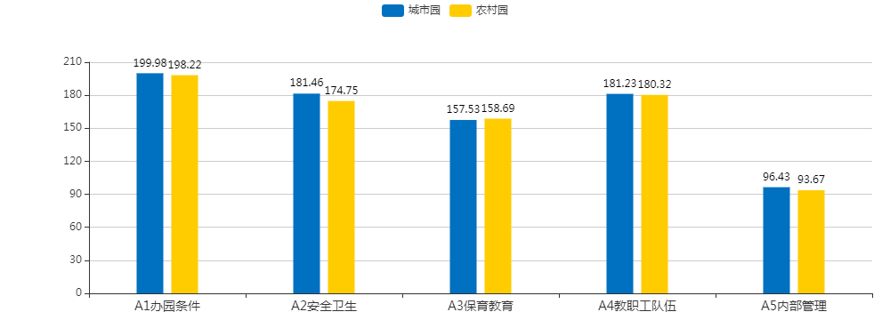 城市园总分平均分值816.63分,其中单项指标平均分值:办园条件199.98分,安全卫生181.46分,保育教育157.53分,教职工队伍181.23分,内部管理96.43分。