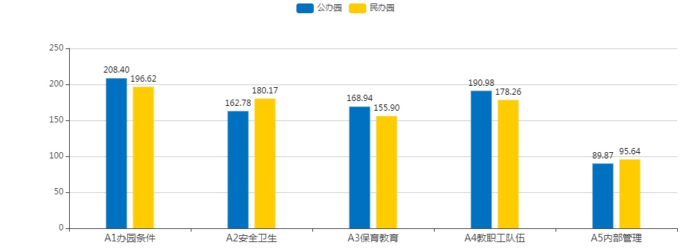 公办园总分平均分值820.98分,其中单项指标平均分值:办园条件208.40分,安全卫生162.78分,保育教育168.94分,教职工队伍190.98分,内部管理89.87分。