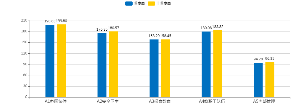 非普惠园总分平均分值818.99分,其中单项指标平均分值:办园条件199.80分,安全卫生180.57分,保育教育158.45分,教职工队伍183.82分,内部管理96.35分。