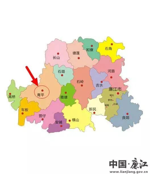 青平镇地处广东省西南部、距离廉江市区40公里,至湛江市区64公里,距广西北海市区130公里,国道G325线由东至西横穿镇域,渝湛高速公路贯穿全境,是通往广西的粤西窗口重镇,西北与广西博白毗邻,该镇与7个乡镇相邻:北面与长山镇、石颈镇毗邻,西面与高桥镇(廉江高桥)、国营红江农场连接,南面与车板镇、营仔镇交界,东面与雅塘镇、石岭镇相接。东北部有一个库容1.46亿立方米的长青水库,总干渠贯穿镇域南北。青平镇被评为广东省城镇建设"岭南杯"竞赛活动达标镇、广东省卫生先进镇,广东省科技兴镇先进镇、试点镇,并被湛江市定为创建生态文明城镇示范镇、广东省中心镇、中国红橙第一镇。