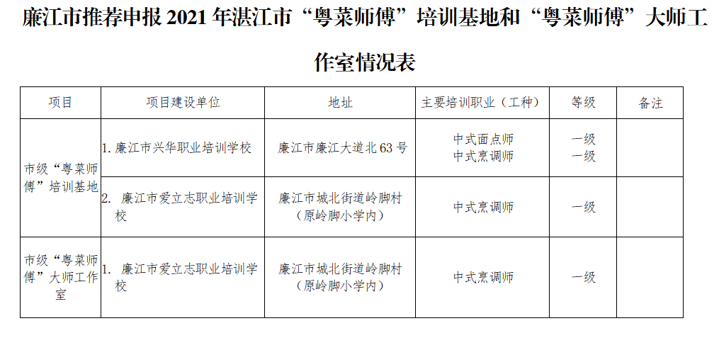 根据湛江市人力资源和社会保障局《关于组织开展湛江市“粤菜师傅”培训基地和“粤菜师傅”大师工作室申报工作的预通知》文件的规定,经申报单位向我局提出书面申请,我局组织专家对申报单位进行评审、实地核查等情况。现对拟推荐设立2021年湛江市“粤菜师傅”培训基地和“粤菜师傅”大师工作室的候选单位进行公示(详见附件),公示时间从2021年11月30日至12月4日。如对公示人员有异议,请向廉江市人力资源和社会保障局就业培训股反映情况。联系电话:0759-6628565。