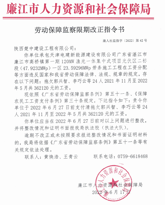 劳动保障监察限期改正指令书(廉人社监指字〔2022〕第42号)