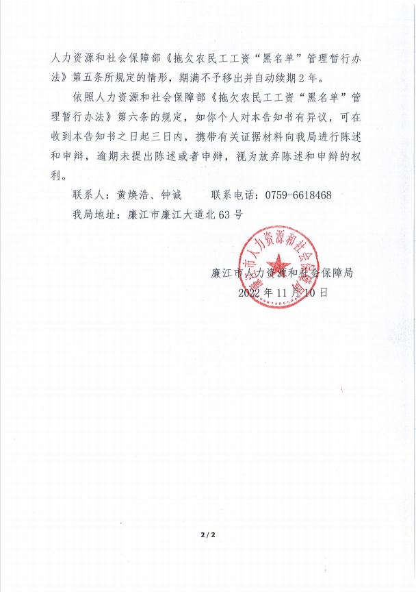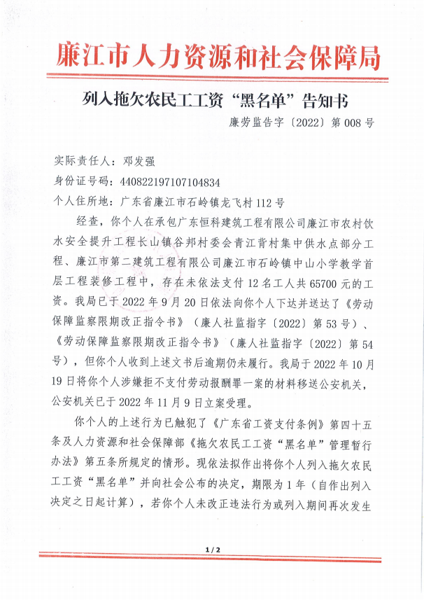 列入拖欠农民工工资“黑名单”告知书(廉劳监告字〔2022〕第008号)