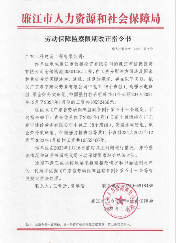 劳动保障监察限期改正指令书(廉人社监指字〔2023〕第2号)