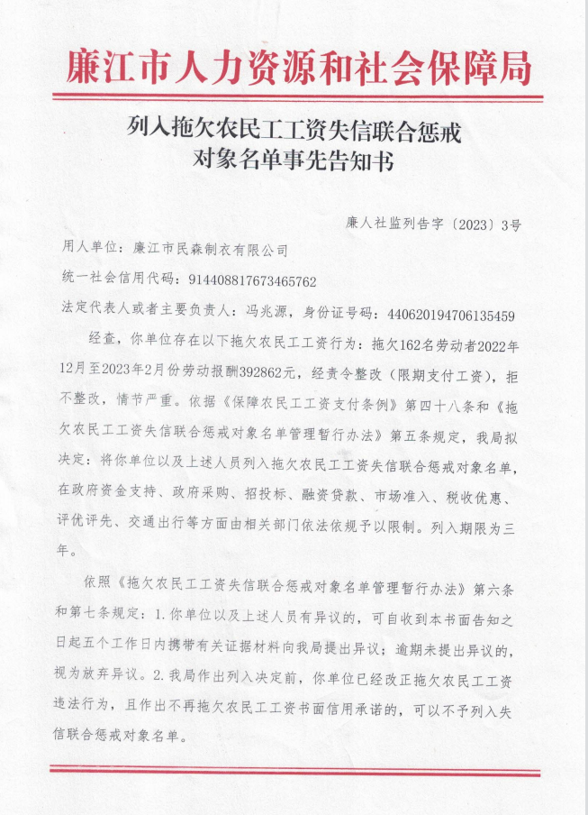 列入拖欠农民工工资失信联合惩戒对象名单事先告知书(廉人社监列告字〔2023〕3号)