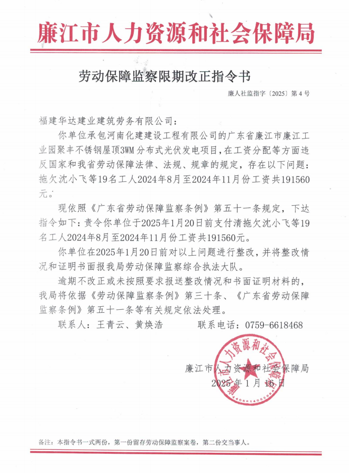劳动保障监察限期改正指令书 (廉人社监指字〔2025〕第4号)