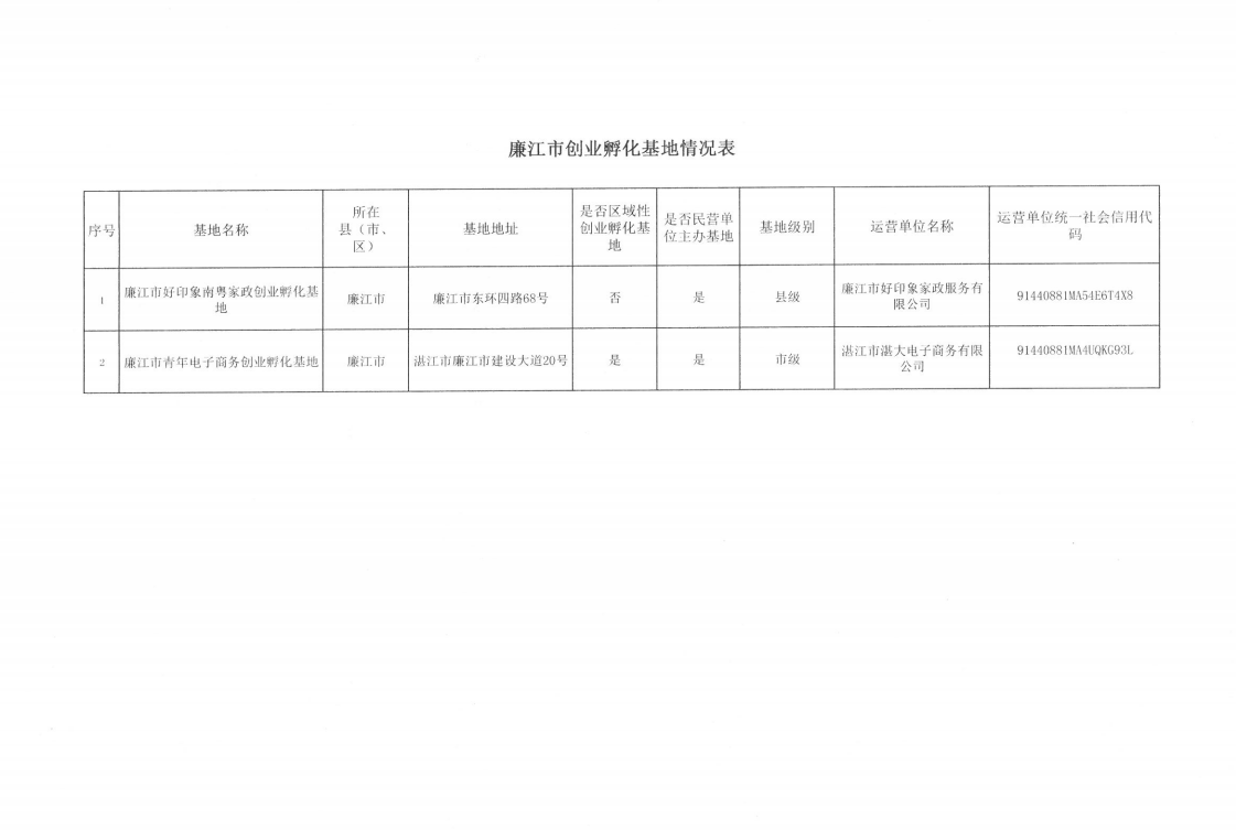廉江市创业孵化基地情况表