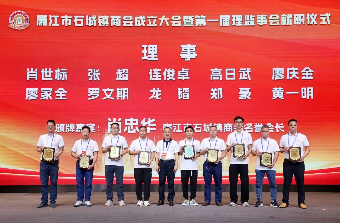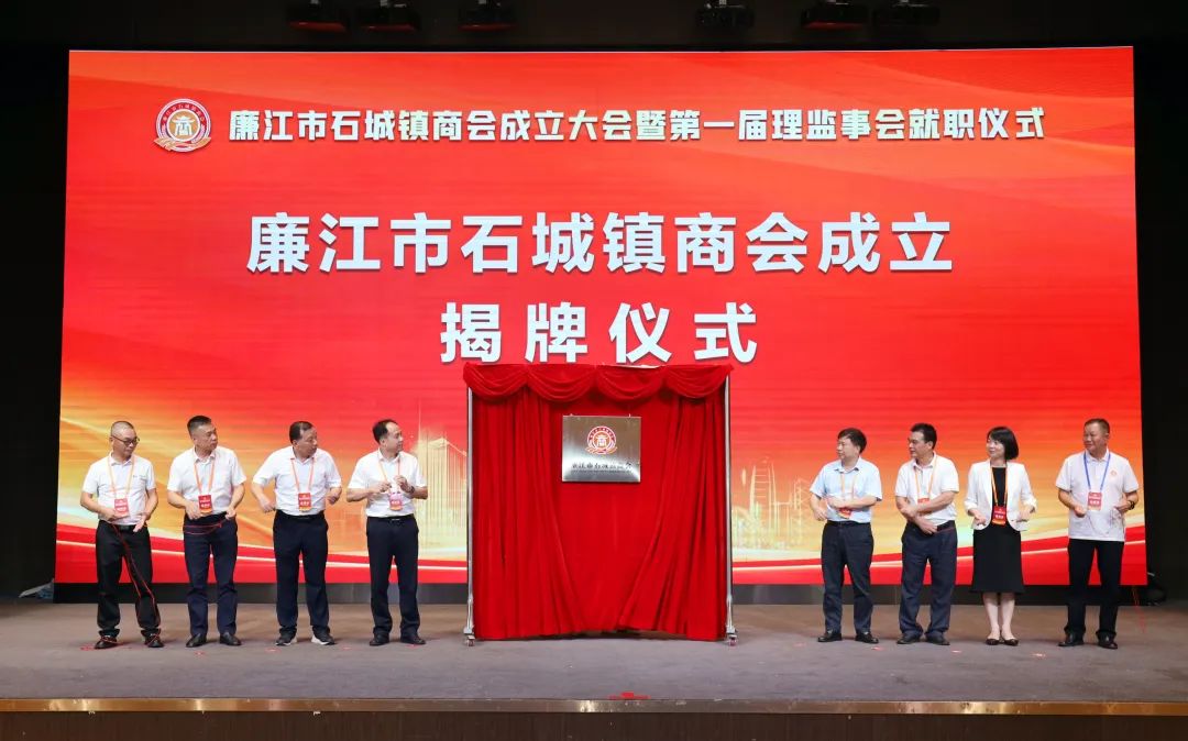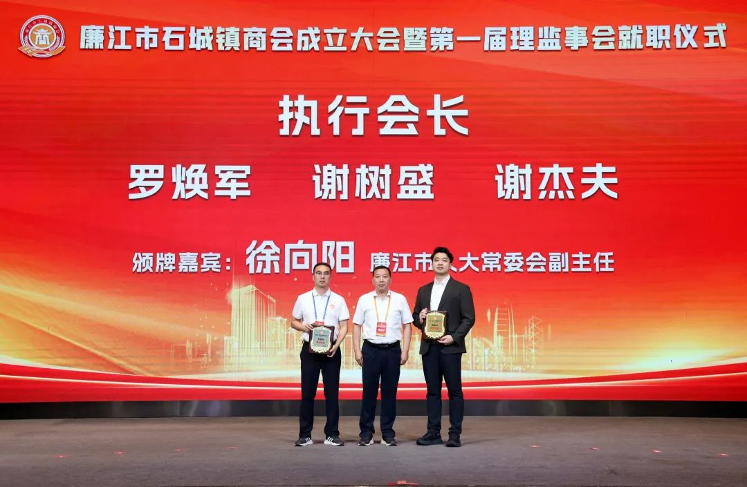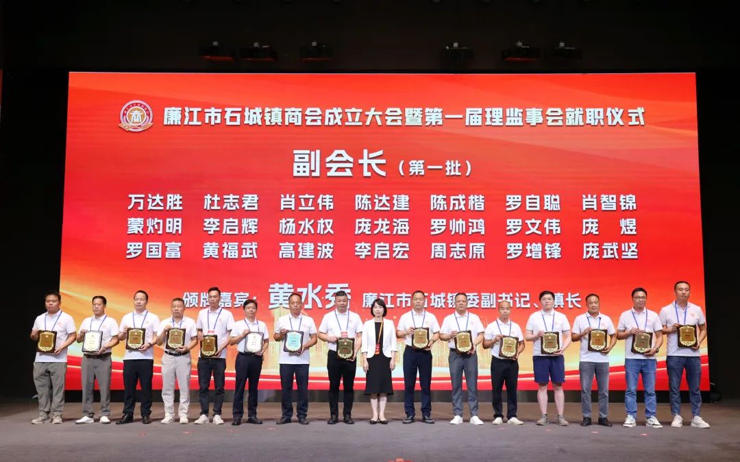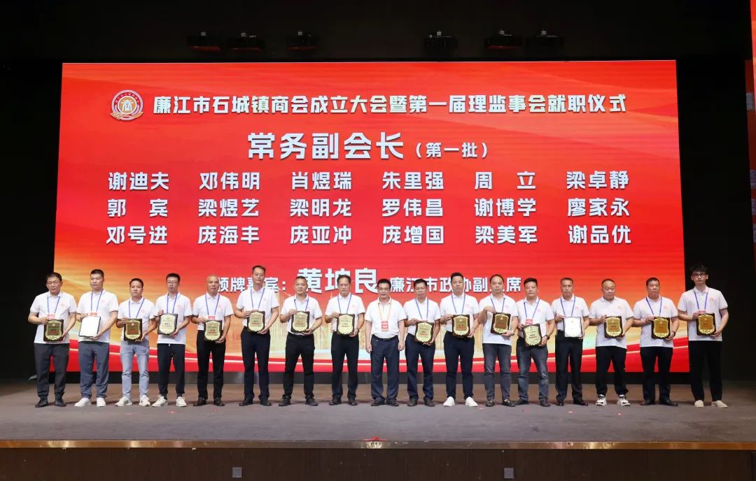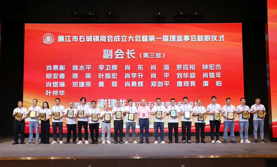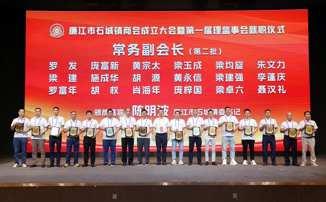 市人大常委会党组书记、主任陈炜飞,市政协党组书记、主席黄大庆,市人大常委会副主任徐向阳、市政协副主席黄坤良等领导为石城镇商会揭牌,并为商会会长肖庆辉;名誉会长谢建龙、庞成湖、肖忠华、李始枢、朱里文、庞权、朱伟强、朱爱武、黎文杰、肖焕;执行会长罗焕军、谢树盛、谢杰夫;以及常务副会长、监事长、秘书长、副秘书长、副会长、理事等颁发当选牌匾和任命书。