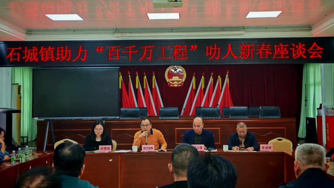 近日,石城镇召开助力“百千万工程”“叻人”新春座谈会,总结工作成效、交流实践经验,进一步凝聚乡村振兴和“百千万工程”工作合力。石城镇党委书记刘付剑辉出席会议并讲话,镇人大主席罗立锋主持会议。石城镇相关领导班子成员、各村(社区)“叻人”代表参加会议。