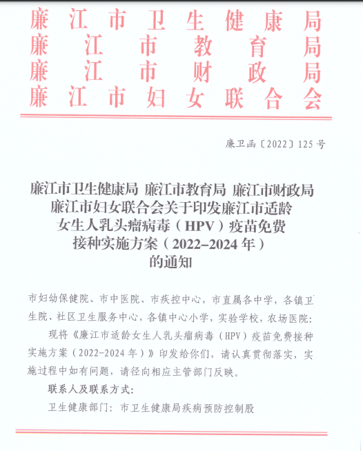 为贯彻落实“健康中国行动•癌症防治行动”,响应世界卫生组织《加速消除宫颈癌全球战略》中提出的“在90%的15岁以下女孩中完成HPV预防性疫苗全程免疫”计划,预防宫颈癌发病和降低宫颈癌患病率,切实保障女性健康。2022年09月17日,廉江市卫生健康局全面启动适龄女生HPV疫苗首针接种行动。根据接种实施方案,全市共设置29个免费接种点(见廉江市HPV疫苗免费接种定点单位),市妇幼保健院、市中医院、各镇卫生院、社区卫生服务中心、农场医院承担适龄女生HPV疫苗接种任务,将对具有廉江市学籍,新进初中一年级尚未接种HPV疫苗且未满14周岁的女生按知情、自愿和免费的原则,免费提供国产二价HPV疫苗接种服务。