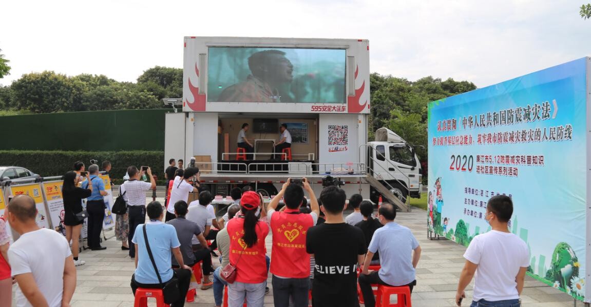 在现场体验知识咨询会场,地震体验车为市民群众提供地震模拟体验、触电体验、火灾烟道体验和醉驾体验,专业人员讲解心肺复苏、防毒面罩使用以及家庭应急物资配备等知识,播放防震自救等防灾减灾知识视频。并设立防灾减灾救灾知识咨询台,围绕防震减灾科普知识和儿童应急自救教育等知识接受广大市民群众咨询,发放了《中华人民共和国防震减灾法》《广东省防震减灾知识100问》《宝贝减灾工具书家庭篇》等宣传手册,设立了防灾减灾专题宣传展板,进一步提高市民群众防灾减灾救灾意识和能力,广泛动员全社会重视参与防灾减灾事业。