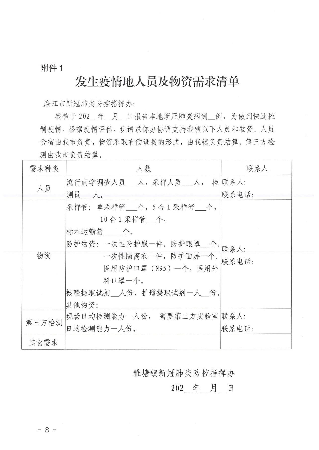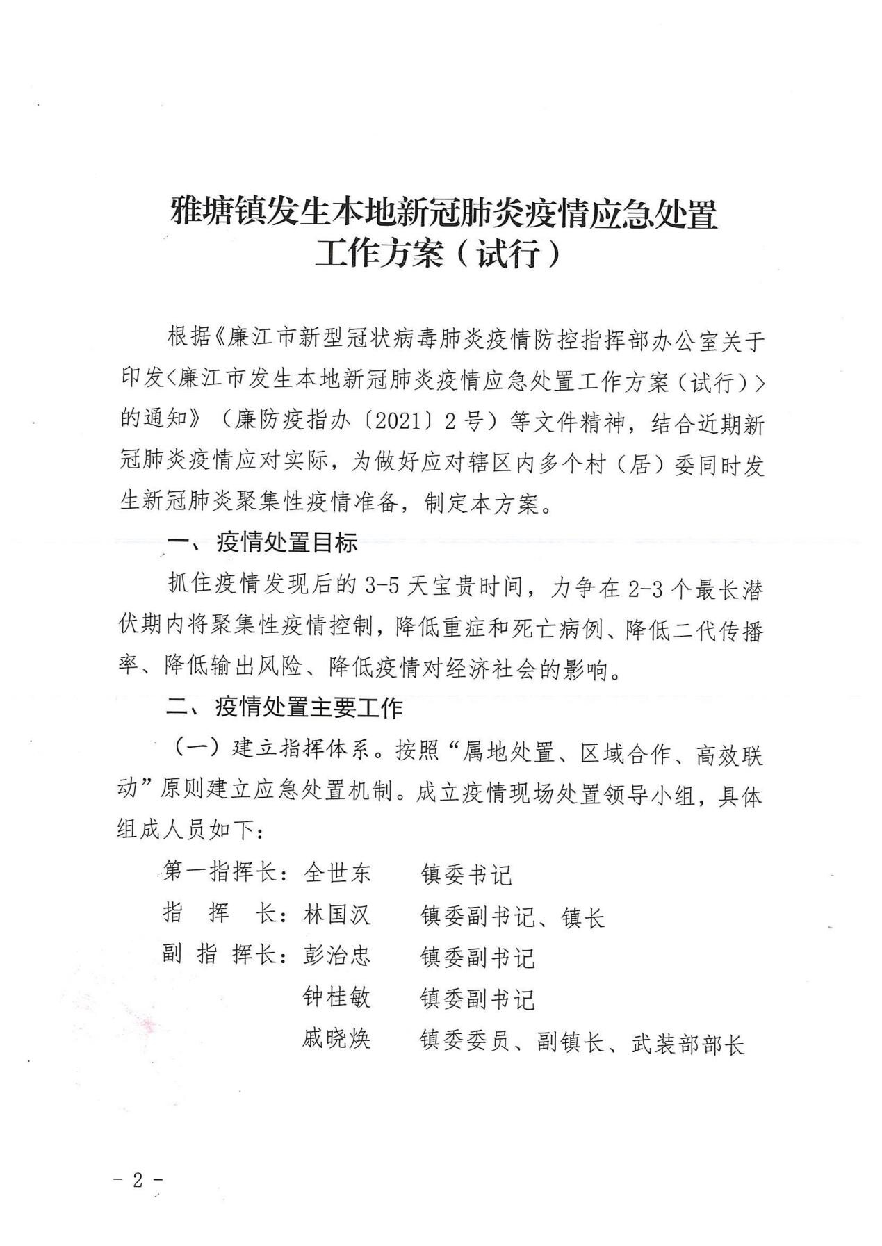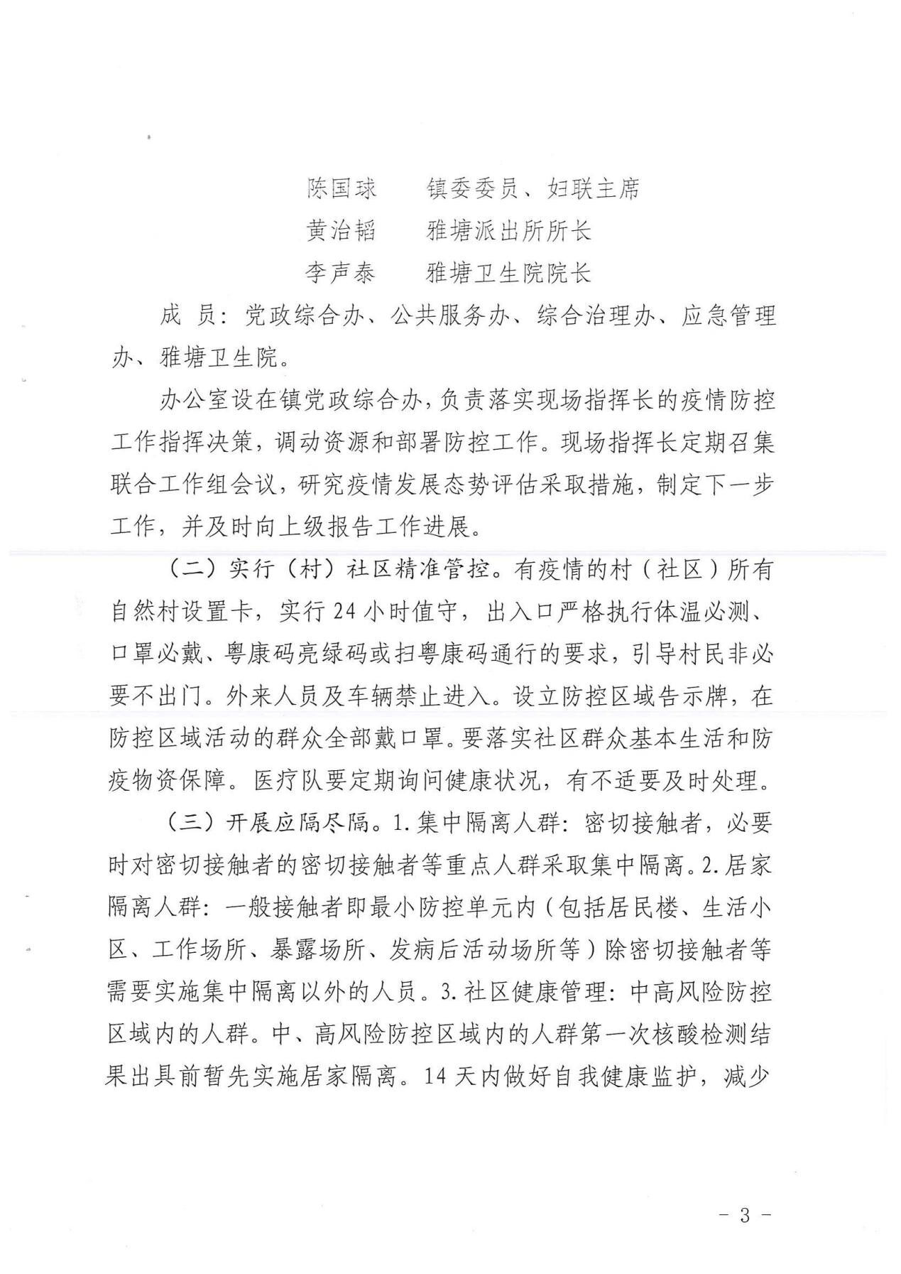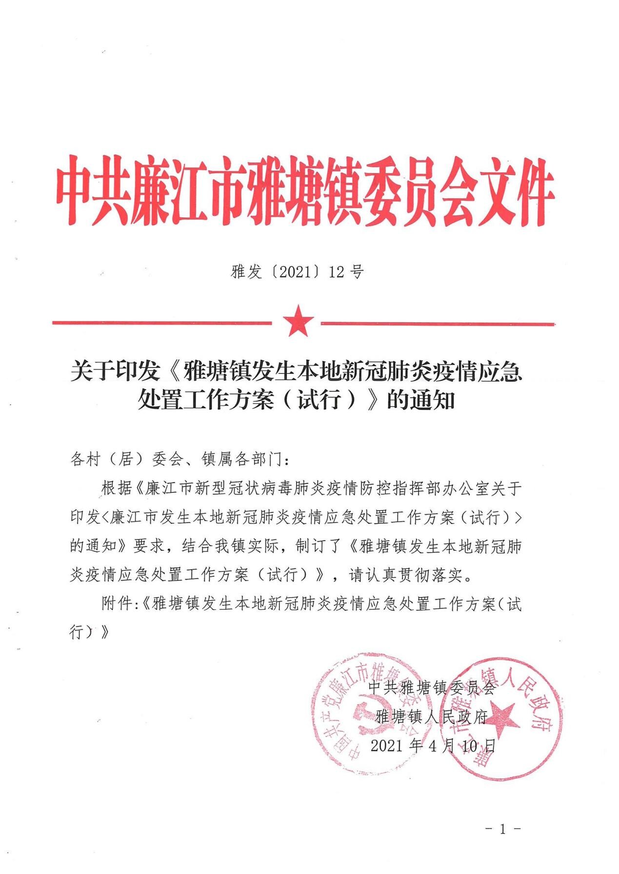 关于印发《雅塘镇发生本地新冠肺炎疫情应急处置工作方案(试行)》的通知