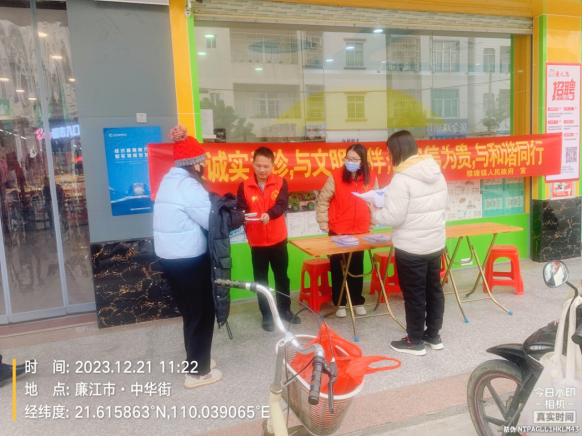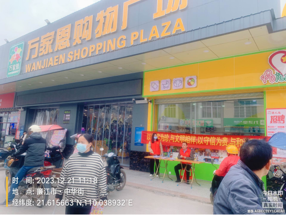 志愿服务队来到雅塘万家恩超市门前广场,悬挂横幅“以诚实为真,与文明相伴;以守信为贵,与和谐同行”、发放“湛江市企业信用知识读本”宣传折页,向群众讲解信用相关内容,让广大群众对社会信用体系有更加深入的了解。积极引导群众在日常生活中讲诚信、重信用,以诚实守信为荣,让诚信深入人心。