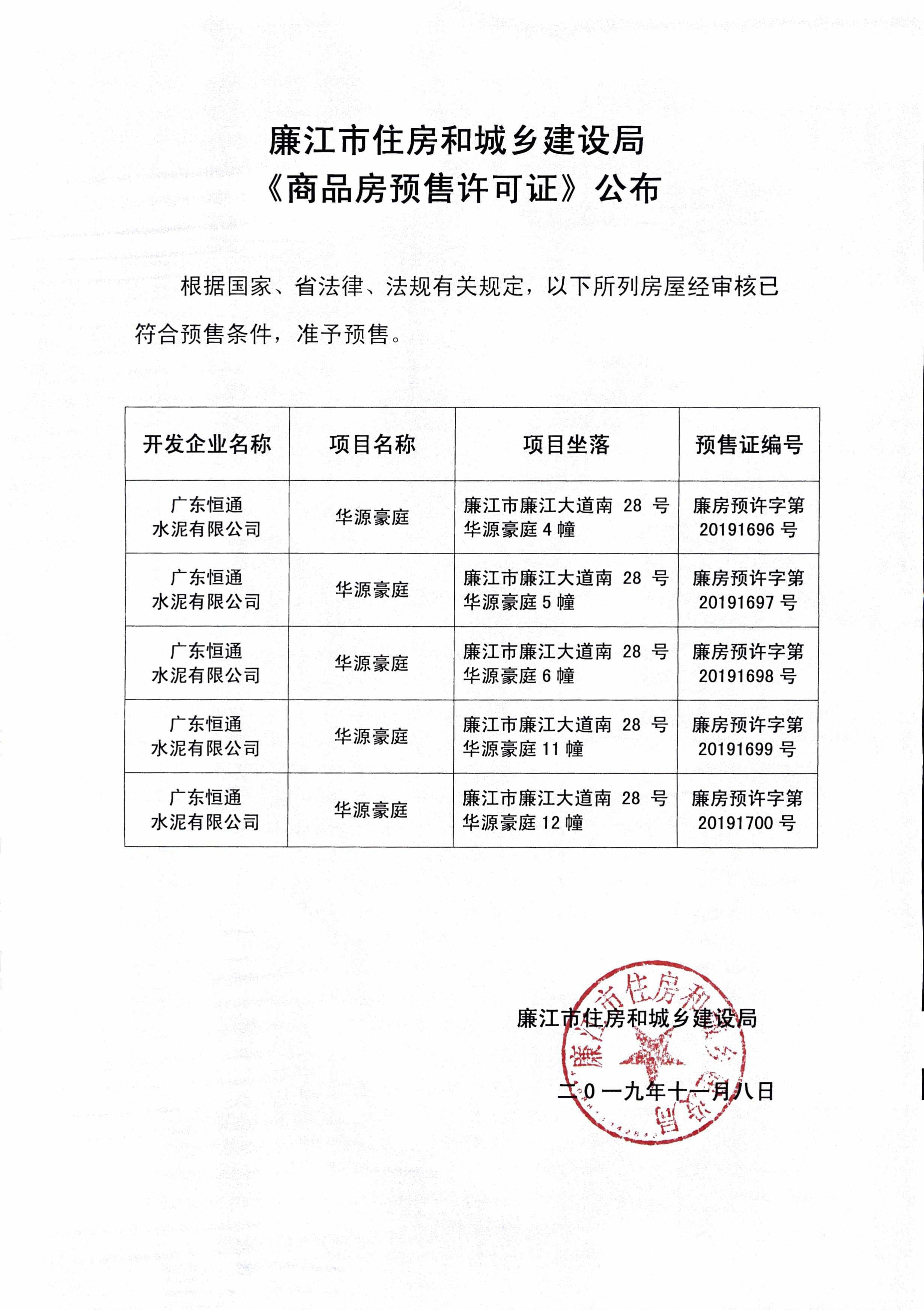 廉江市住房和城乡建设局《商品房预售许可证》公布——华源豪庭