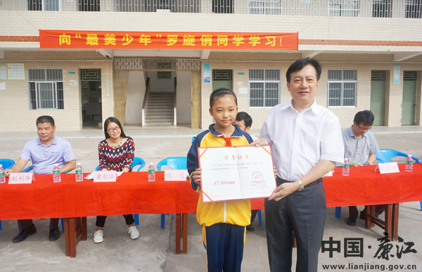 11月15日,湛江晚报联合阿里巴巴“天天正能量”到安铺镇第四小学,为敢于乐于助人的该校六(1)班罗旋俏同学颁发“天天正能量”特等奖荣誉证书。