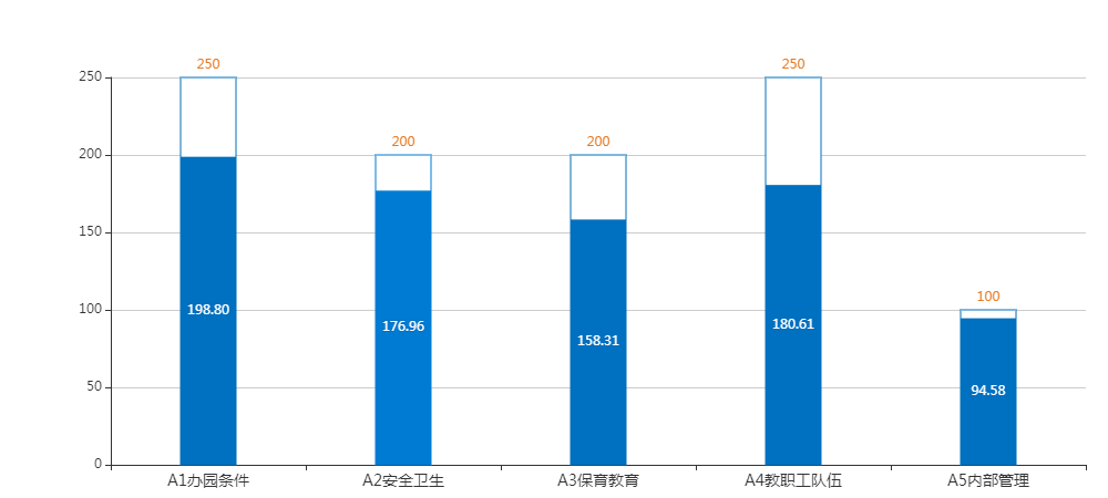 公办园总分平均分值820.98分,其中单项指标平均分值:办园条件208.40分,安全卫生162.78分,保育教育168.94分,教职工队伍190.98分,内部管理89.87分。