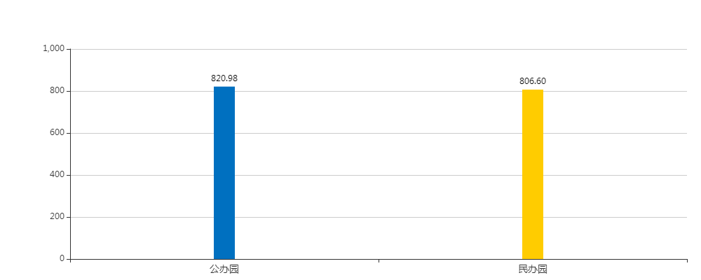 城市园总分平均分值816.63分,其中单项指标平均分值:办园条件199.98分,安全卫生181.46分,保育教育157.53分,教职工队伍181.23分,内部管理96.43分。