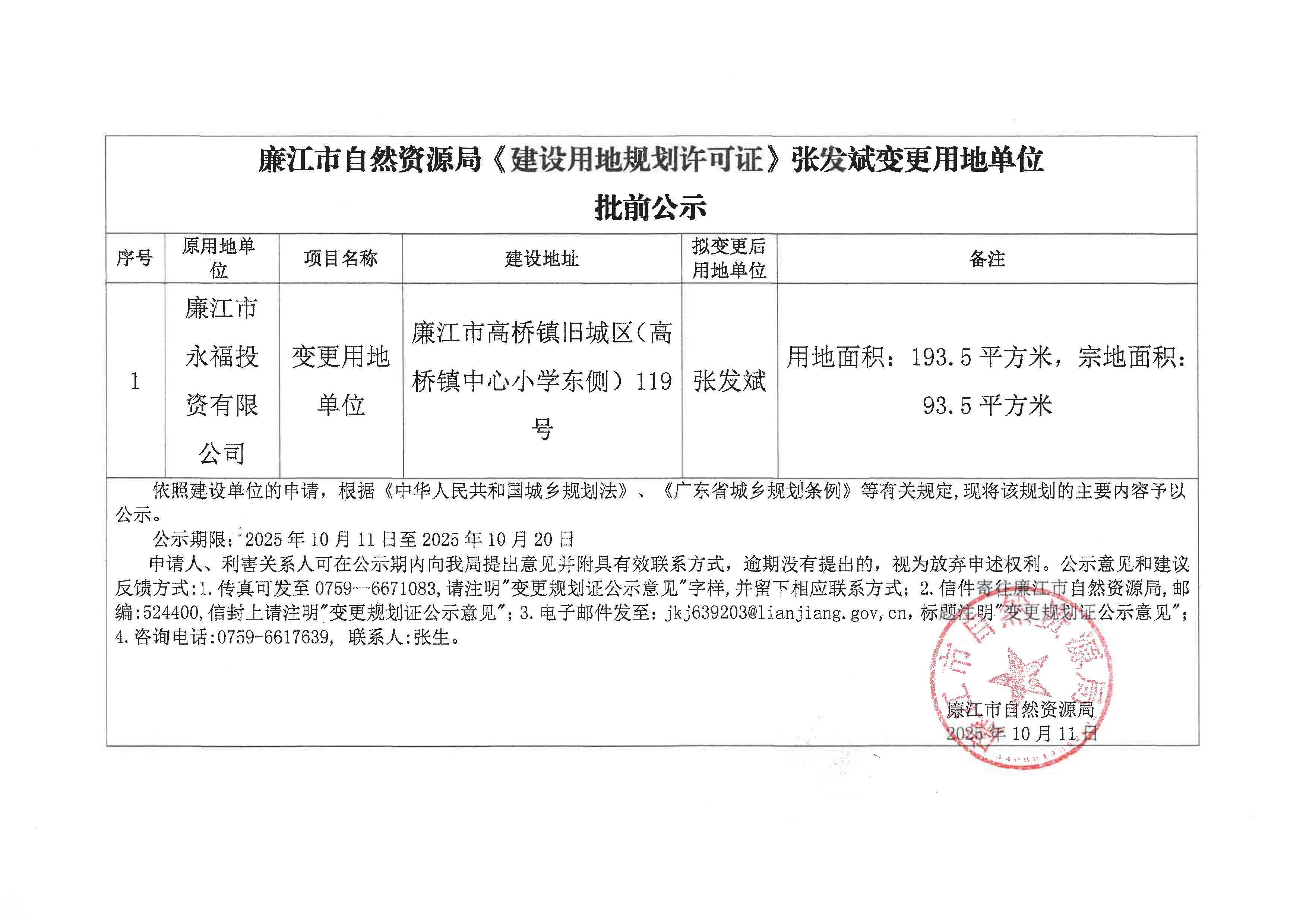 廉江市永福投资有限公司转张发斌变更批前公示