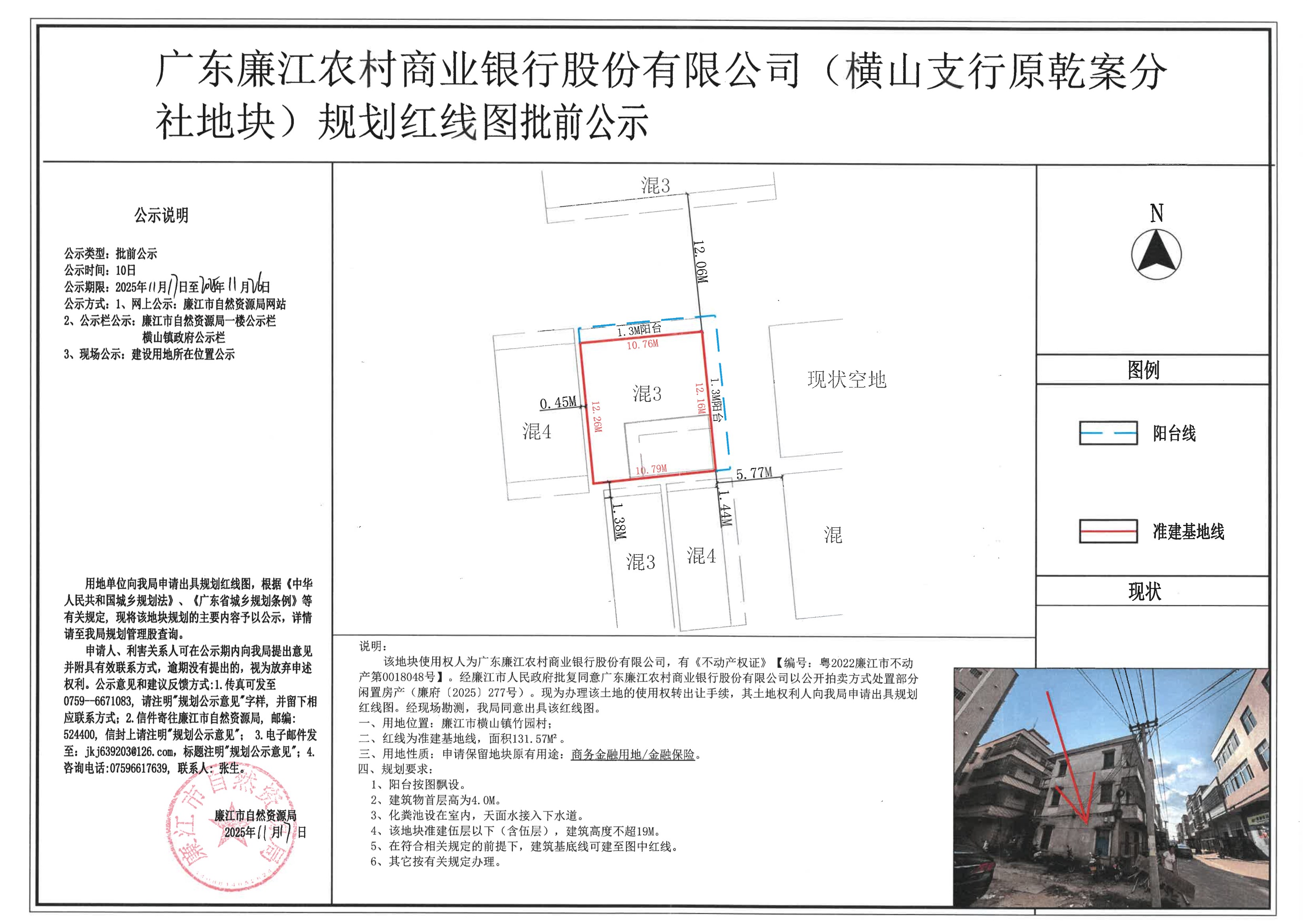 广东廉江农村商业银行股份有限公司(横山支行原乾案分社地块)规划红线图批前公示