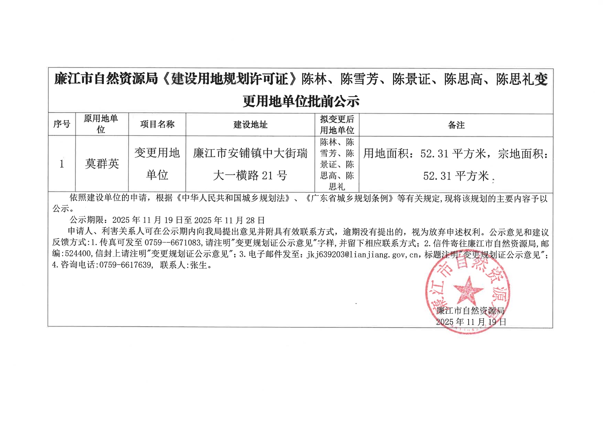 廉江市自然资源局《建设用地规划许可证》陈林、陈雪芳、陈景证、陈思高、陈思礼变更用地单位批前公示