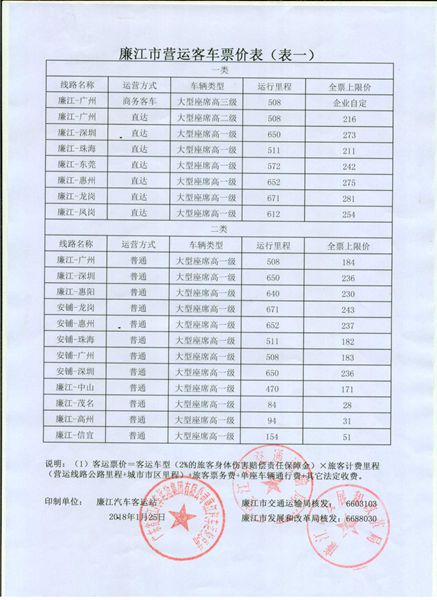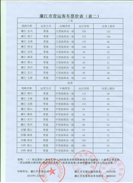 廉江市2018年春运营运客车票价表