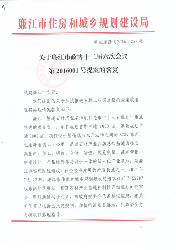 石材工业园作为我市重点建设项目,选址于塘蓬镇遂六线安和段附近,涵盖塘蓬镇、东升农场、石岭镇,规划近期开发1000亩,远期规划3000亩。建设该工业园有利于将我市石材产业由“马路经济”向“园区经济”转型,着力打造粤西地区的石材产业基地,带动山区经济发展。目前,我市已成立了以市政府领导为组长的塘蓬镇石材专业市场建设工作领导小组,发挥了领导与协调的职能,加快了征地和规划的进度,已征地600多亩,基本完成工业园区总体规划工作。东莞市周氏集团已于2015年初与市政府签定投资意向书,注册成立了“廉江市周氏石材有限公司”和“廉江中仁投资有限公司”, 并开展石材工业园区投资建设的前期工作。周氏集团计划投资16亿元,预计带来一次性税收12亿元(物业销售环节),年上缴交易税1.5亿元(市场年交易税),解决就业1万多人。